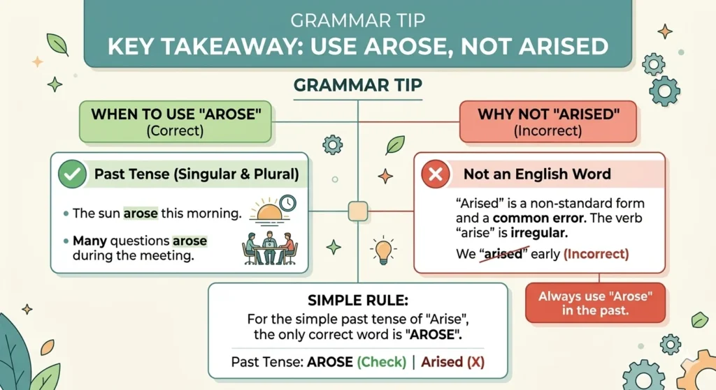 The confusion between arised vs arose is very common, but the rule is simple once you understand it. “Arose” is the correct past tense of “arise,” while “arised” is incorrect and should be avoided. This mistake often happens because many English verbs follow regular patterns, but “arise” is an irregular verb.