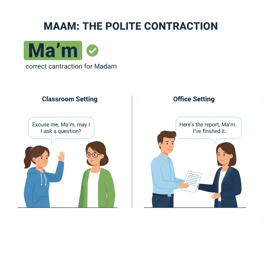 If you’re wondering “Is it m am or ma am?” — the clear answer is ma’am, with an apostrophe replacing the missing letters.