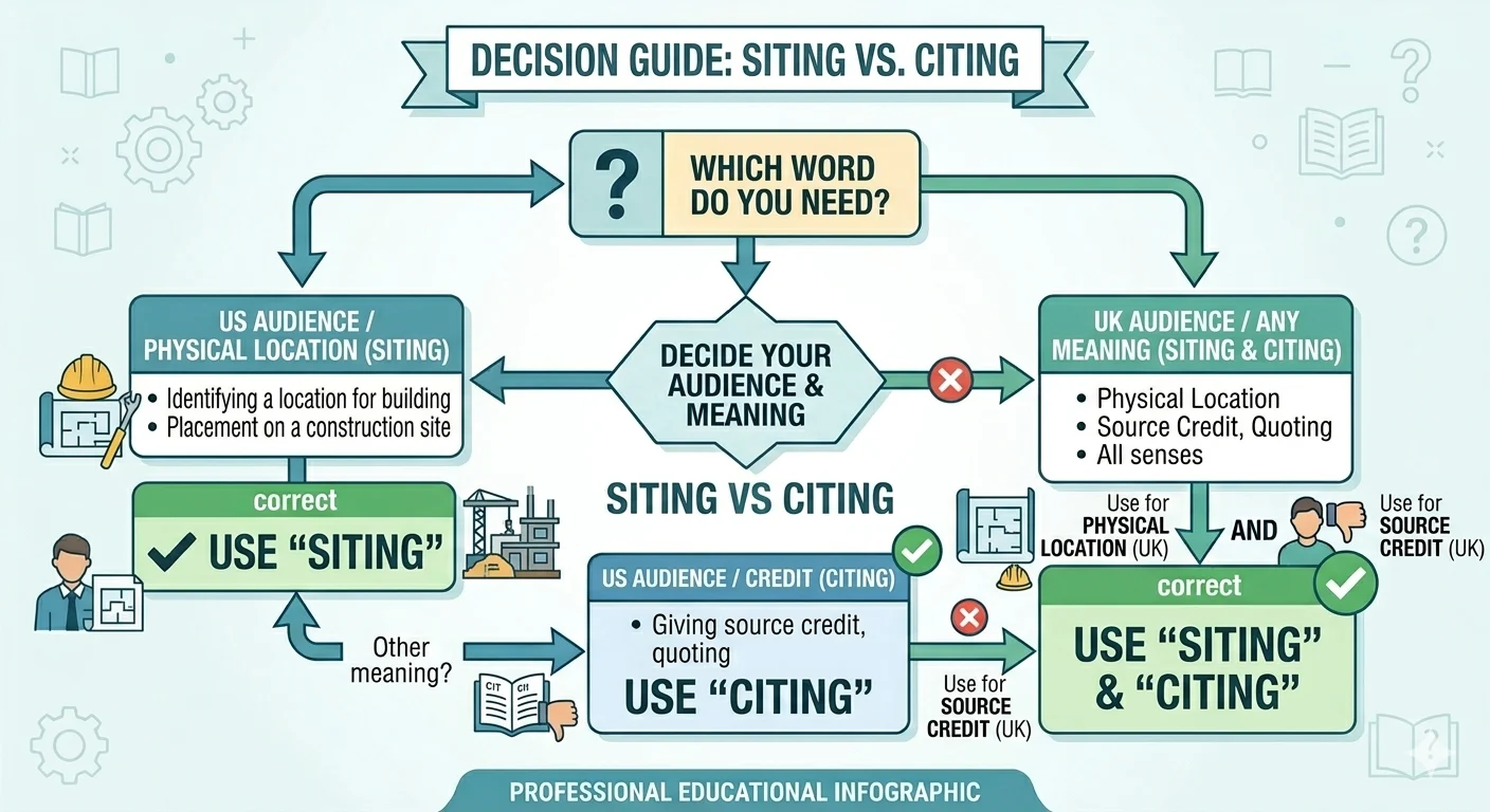 Understanding siting vs citing is easier than it first seems. The confusion comes from their identical pronunciation, but their meanings are very different. Siting is all about location. It is used when placing buildings, offices, or projects. Citing, on the other hand, is about referencing sources. It is common in essays, research papers, and professional writing.