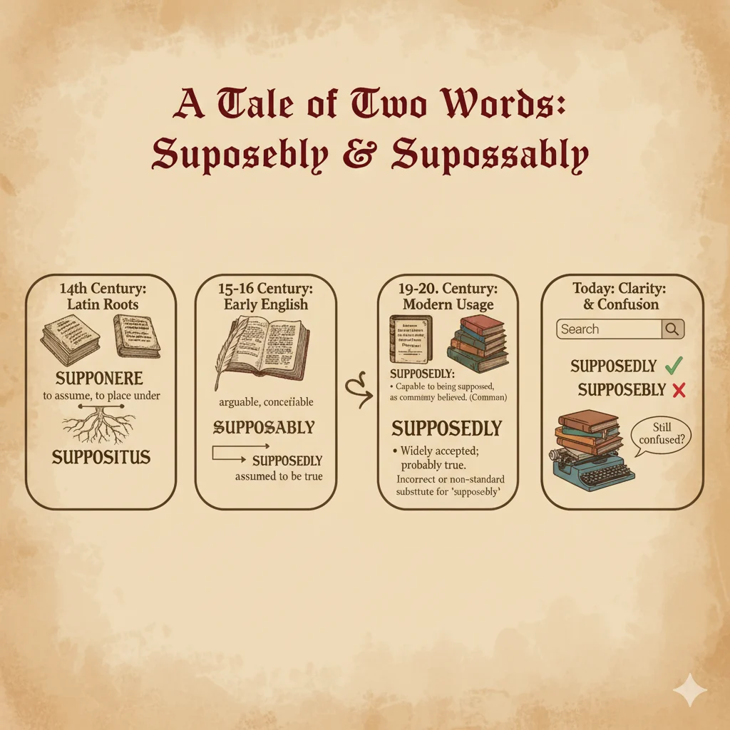 The word supposably appeared later in English. It was formed from the adjective supposable, which means something that can be imagined or assumed. Adding “-ly” created supposably.
