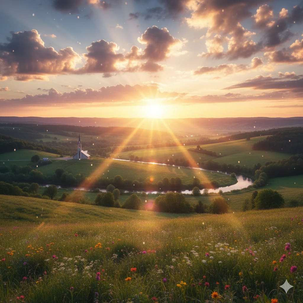 Soft sunrise scenes, nature imagery, peaceful quotes, and warm color tones enhance spiritual emotion and reflect morning calm.