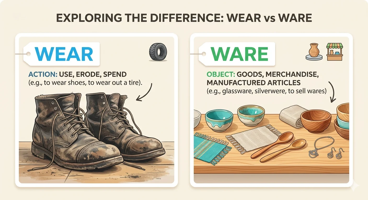 Understanding wear vs ware is simple once you focus on meaning instead of spelling. Even though both words sound the same, their uses are completely different. Wear relates to use, damage, or clothing, while ware refers to goods or products.